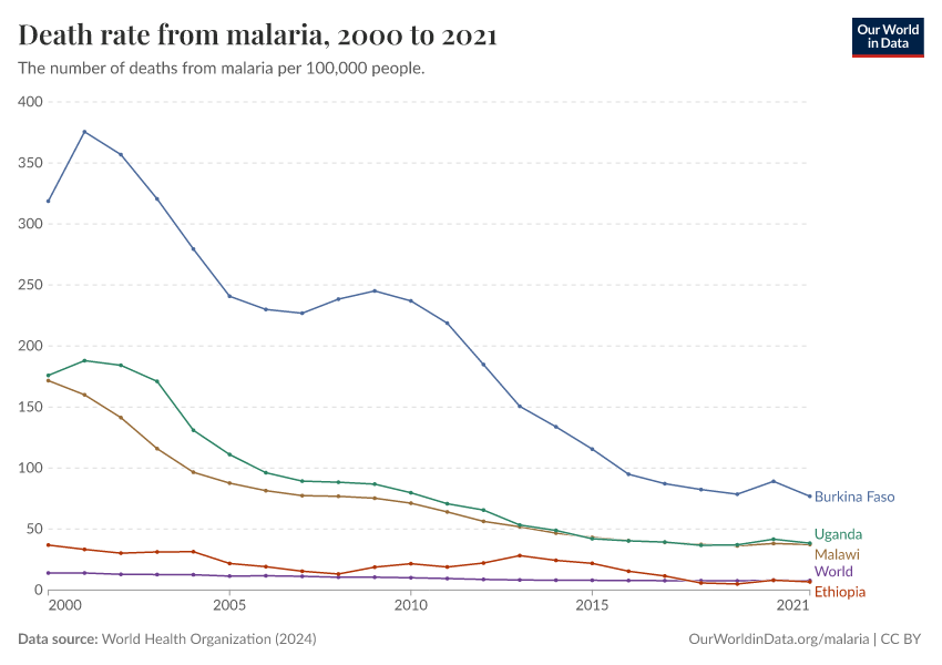 World Health Organization (2024) – with major processing by Our World in Data. “Death rate from malaria” [dataset]. World Health Organization, “Global Health Estimates” [original data]. Retrieved April 6, 2026 from https://archive.ourworldindata.org/20260325-171315/grapher/death-rate-from-malaria-ghe.html (archived on March 25, 2026).Download