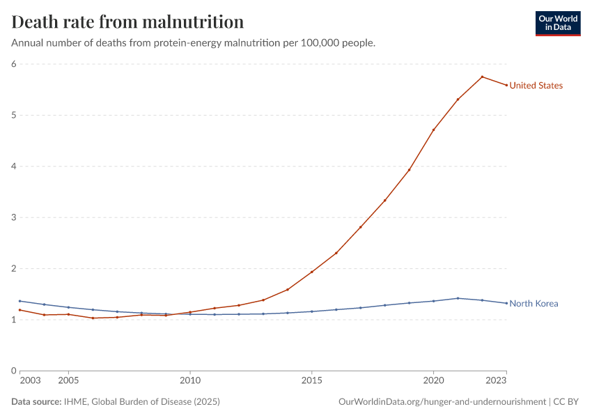 IHME, Global Burden of Disease (2025) – with major processing by Our World in Data. “Death rate from malnutrition – IHME” [dataset]. IHME, Global Burden of Disease, “Global Burden of Disease - Deaths” [original data]. Retrieved April 4, 2026 from https://archive.ourworldindata.org/20260323-161325/grapher/death-rate-from-malnutrition.html (archived on March 23, 2026).