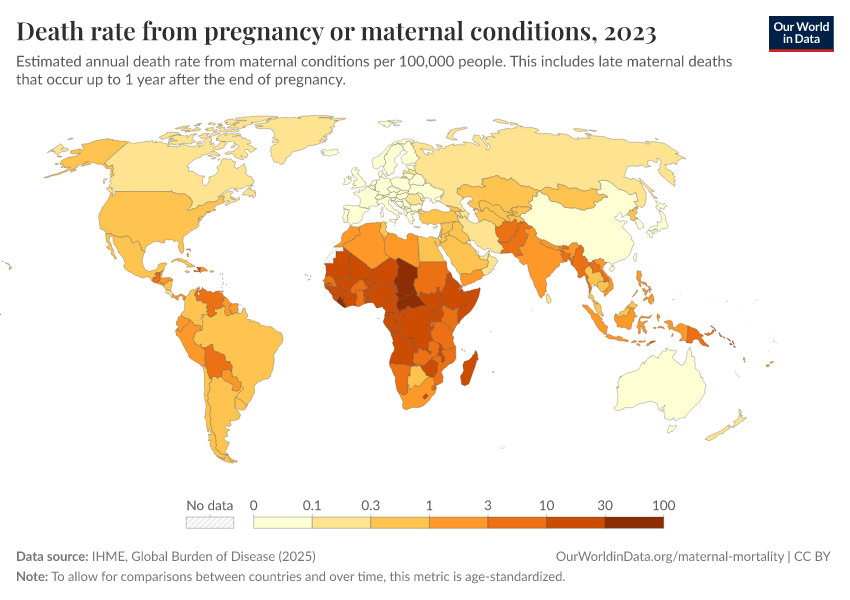 IHME, Global Burden of Disease (2025) – with major processing by Our World in Data. “Death rate from pregnancy or maternal conditions – IHME” [dataset]. IHME, Global Burden of Disease, “Global Burden of Disease - Deaths” [original data]. Retrieved April 5, 2026 from https://archive.ourworldindata.org/20260323-161325/grapher/death-rate-from-maternal-disorders-ihme.html (archived on March 23, 2026).