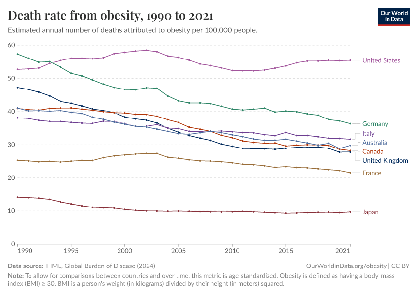 IHME, Global Burden of Disease (2024) – with minor processing by Our World in Data. “Death rate from obesity” [dataset]. IHME, Global Burden of Disease, “Global Burden of Disease - Risk Factors” [original data]. Retrieved November 10, 2025 from https://archive.ourworldindata.org/20250909-093708/grapher/death-rate-from-obesity.html (archived on September 9, 2025).