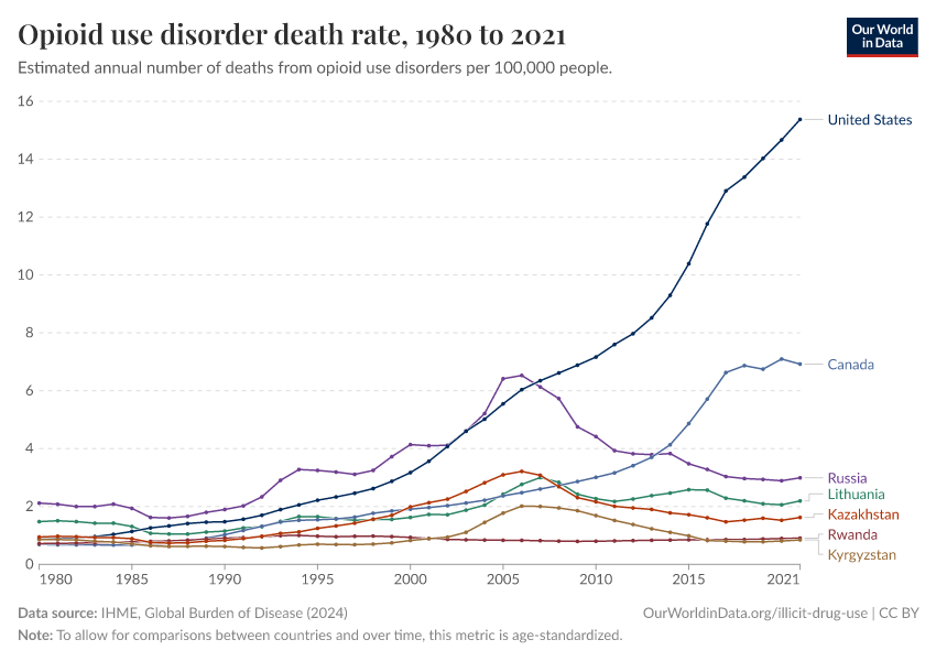 IHME, Global Burden of Disease (2024) – with minor processing by Our World in Data. “Opioid use disorder death rate” [dataset]. IHME, Global Burden of Disease, “Global Burden of Disease - Deaths and DALYs” [original data]. Retrieved November 16, 2025 from https://archive.ourworldindata.org/20250909-093708/grapher/death-rate-from-opioid-use.html (archived on September 9, 2025).