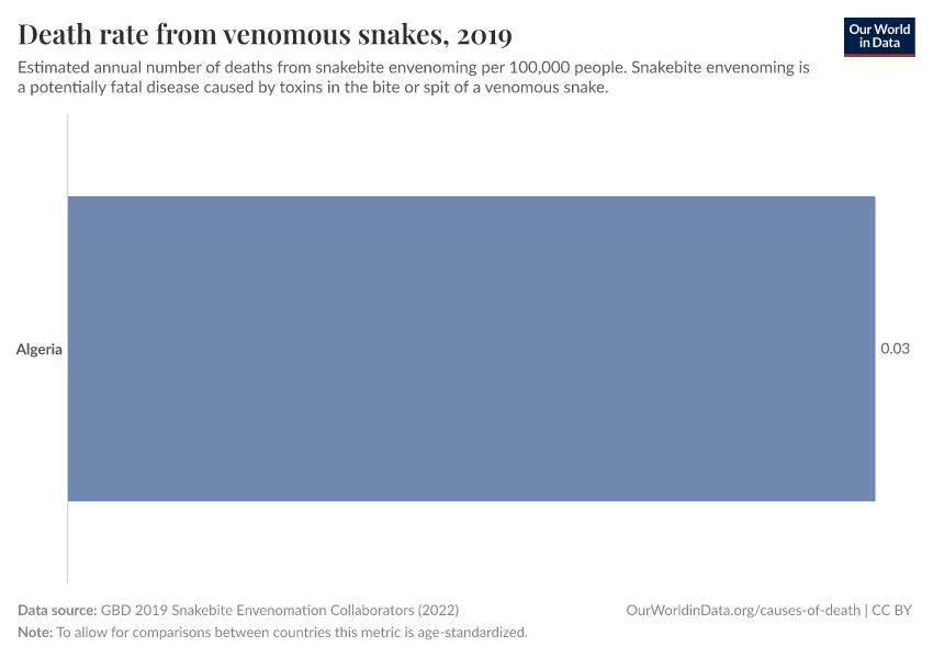 “Data Page: Death rate from venomous snakes”. Our World in Data (2025). Data adapted from GBD 2019 Snakebite Envenomation Collaborators. Retrieved from https://archive.ourworldindata.org/20250909-093708/grapher/death-rate-from-snakebite-envenoming.html [online resource] (archived on September 9, 2025).