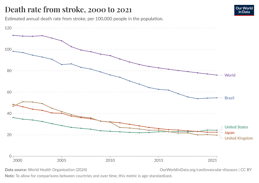 World Health Organization (2024) – with major processing by Our World in Data. “Death rate from stroke” [dataset]. World Health Organization, “Global Health Estimates” [original data]. Retrieved January 15, 2026 from https://archive.ourworldindata.org/20250909-093708/grapher/death-rate-from-strokes-who.html (archived on September 9, 2025).