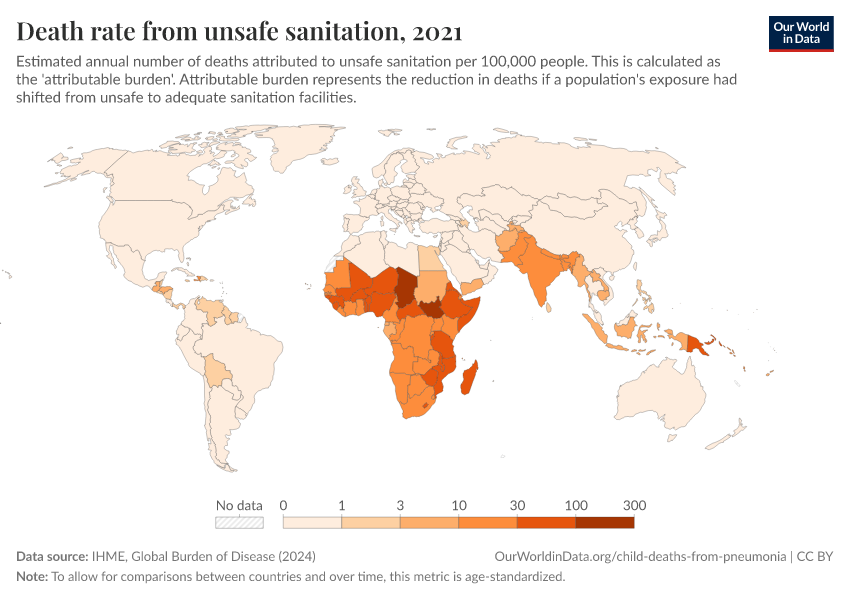 IHME, Global Burden of Disease (2024) – with minor processing by Our World in Data. “Death rate from unsafe sanitation” [dataset]. IHME, Global Burden of Disease, “Global Burden of Disease - Risk Factors” [original data]. Retrieved January 15, 2026 from https://archive.ourworldindata.org/20250909-093708/grapher/death-rate-from-unsafe-sanitation.html (archived on September 9, 2025).