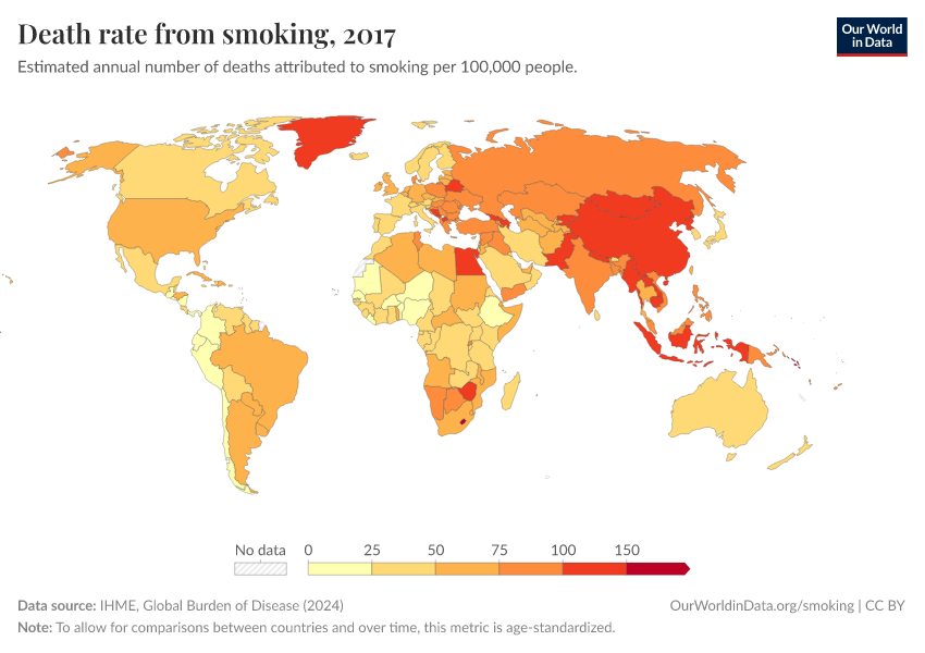IHME, Global Burden of Disease (2024) – with minor processing by Our World in Data. “Death rate from smoking” [dataset]. IHME, Global Burden of Disease, “Global Burden of Disease - Risk Factors” [original data]. Retrieved December 27, 2025 from https://archive.ourworldindata.org/20250909-093708/grapher/death-rate-smoking.html (archived on September 9, 2025).