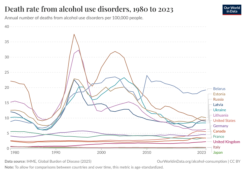IHME, Global Burden of Disease (2025) – with major processing by Our World in Data. “Death rate from alcohol use disorders – IHME” [dataset]. IHME, Global Burden of Disease, “Global Burden of Disease - Deaths” [original data]. Retrieved April 4, 2026 from https://archive.ourworldindata.org/20260323-161325/grapher/death-rates-from-alcohol-use-disorders.html (archived on March 23, 2026).