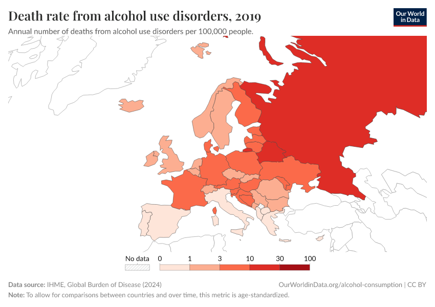 IHME, Global Burden of Disease (2024) – with minor processing by Our World in Data. “Death rate from alcohol use disorders” [dataset]. IHME, Global Burden of Disease, “Global Burden of Disease - Deaths and DALYs” [original data]. Retrieved December 8, 2025 from https://archive.ourworldindata.org/20250909-093708/grapher/death-rates-from-alcohol-use-disorders.html (archived on September 9, 2025).
