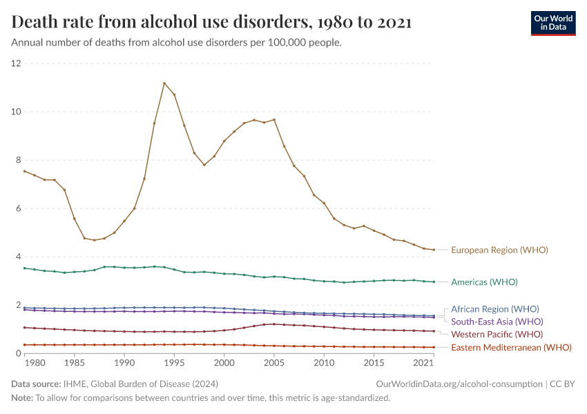 IHME, Global Burden of Disease (2024) – with minor processing by Our World in Data. “Death rate from alcohol use disorders” [dataset]. IHME, Global Burden of Disease, “Global Burden of Disease - Deaths and DALYs” [original data]. Retrieved December 8, 2025 from https://archive.ourworldindata.org/20250909-093708/grapher/death-rates-from-alcohol-use-disorders.html (archived on September 9, 2025).