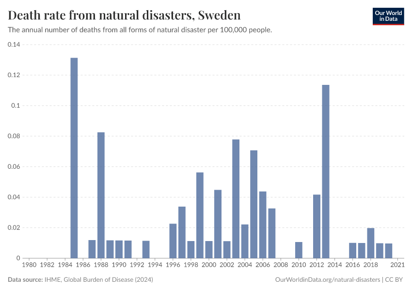 IHME, Global Burden of Disease (2024) – with minor processing by Our World in Data. “Death rate from natural disasters” [dataset]. IHME, Global Burden of Disease, “Global Burden of Disease - Deaths and DALYs” [original data]. Retrieved December 30, 2025 from https://archive.ourworldindata.org/20250909-093708/grapher/death-rates-from-disasters.html (archived on September 9, 2025).
