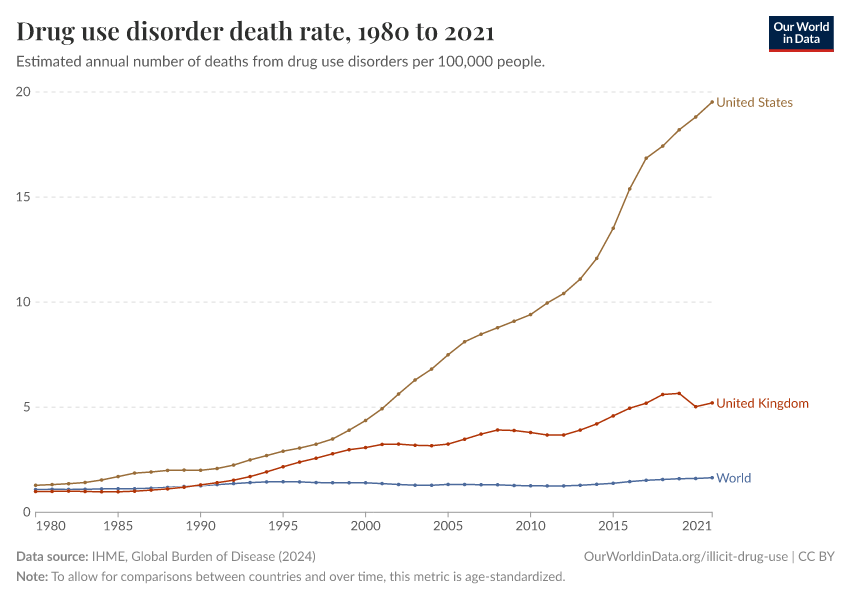 IHME, Global Burden of Disease (2024) – with minor processing by Our World in Data. “Drug use disorder death rate” [dataset]. IHME, Global Burden of Disease, “Global Burden of Disease - Deaths and DALYs” [original data]. Retrieved December 14, 2025 from https://archive.ourworldindata.org/20250909-093708/grapher/death-rates-from-drug-use-disorders.html (archived on September 9, 2025).