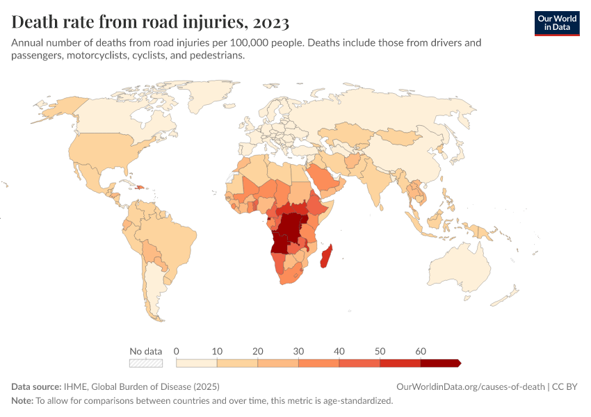 “Data Page: Death rate from road injuries”, part of the following publication: Esteban Ortiz-Ospina and Max Roser (2016) - “Global Health”. Data adapted from IHME, Global Burden of Disease. Retrieved from https://archive.ourworldindata.org/20251029-110753/grapher/death-rates-road-incidents.html [online resource] (archived on October 29, 2025).
