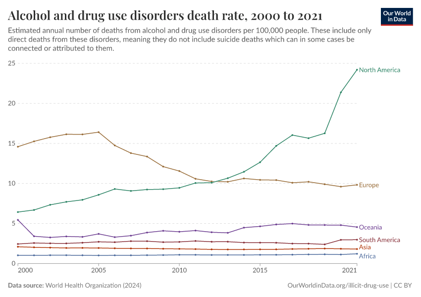 World Health Organization (2024) – with major processing by Our World in Data. “Alcohol and drug use disorders death rate” [dataset]. World Health Organization, “Global Health Estimates” [original data]. Retrieved March 25, 2026 from https://archive.ourworldindata.org/20260325-171315/grapher/death-rates-substance-disorders-who.html (archived on March 25, 2026).