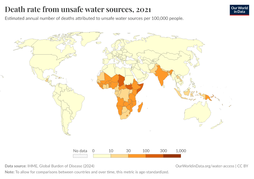 IHME, Global Burden of Disease (2024) – with minor processing by Our World in Data. “Death rate from unsafe water sources” [dataset]. IHME, Global Burden of Disease, “Global Burden of Disease - Risk Factors” [original data]. Retrieved January 2, 2026 from https://archive.ourworldindata.org/20250909-093708/grapher/death-rates-unsafe-water.html (archived on September 9, 2025).