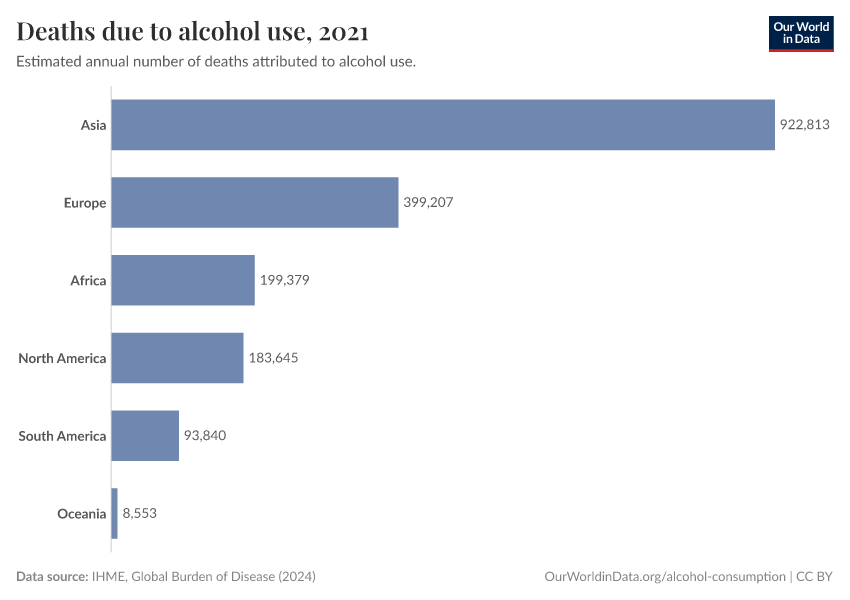 IHME, Global Burden of Disease (2024) – with minor processing by Our World in Data. “Deaths due to alcohol use” [dataset]. IHME, Global Burden of Disease, “Global Burden of Disease - Risk Factors” [original data]. Retrieved December 19, 2025 from https://archive.ourworldindata.org/20250909-093708/grapher/deaths-due-to-alcohol-use.html (archived on September 9, 2025).