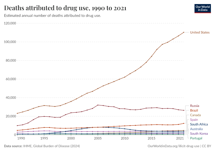 IHME, Global Burden of Disease (2024) – with minor processing by Our World in Data. “Deaths attributed to drug use” [dataset]. IHME, Global Burden of Disease, “Global Burden of Disease - Risk Factors” [original data]. Retrieved January 12, 2026 from https://archive.ourworldindata.org/20250909-093708/grapher/deaths-due-to-drug-use.html (archived on September 9, 2025).