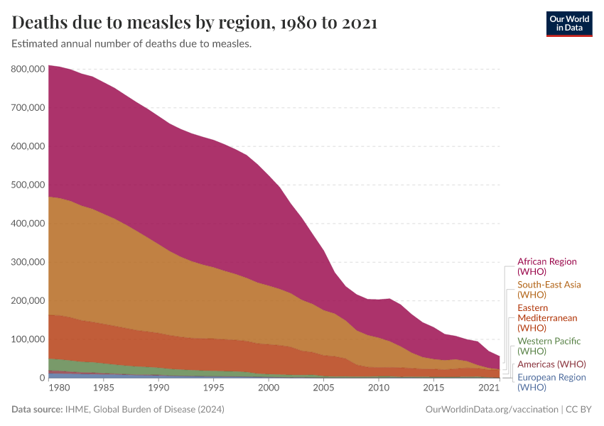“Data Page: Deaths due to measles by region”, part of the following publication: Esteban Ortiz-Ospina and Max Roser (2016) - “Global Health”. Data adapted from IHME, Global Burden of Disease. Retrieved from https://archive.ourworldindata.org/20250909-093708/grapher/deaths-due-to-measles-by-region.html [online resource] (archived on September 9, 2025).How to cite this data