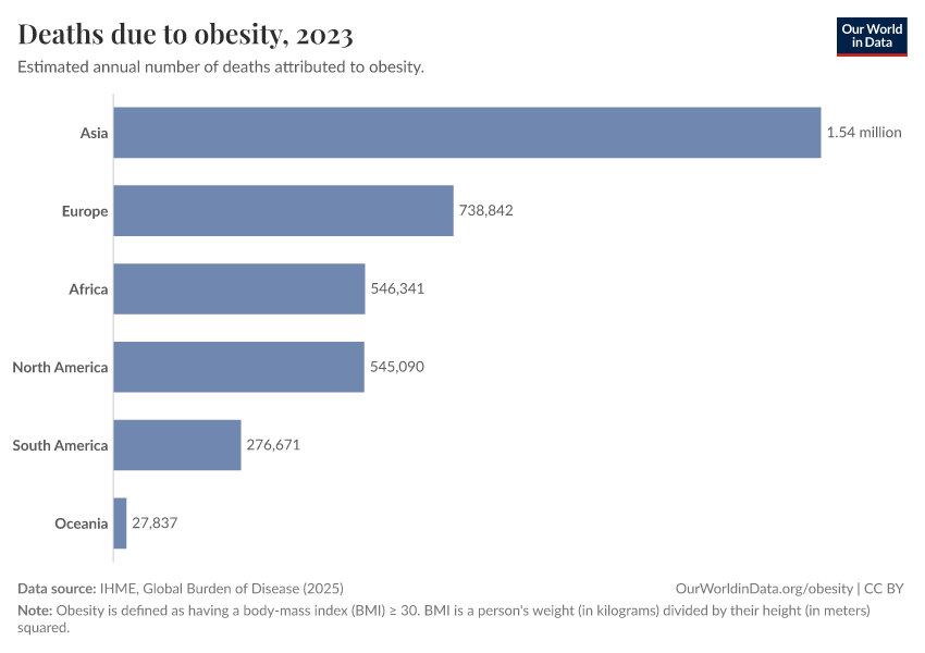 IHME, Global Burden of Disease (2025) – with major processing by Our World in Data. “Deaths due to obesity – IHME” [dataset]. IHME, Global Burden of Disease, “Global Burden of Disease - Risk Factors - Deaths” [original data]. Retrieved April 16, 2026 from https://archive.ourworldindata.org/20260319-180137/grapher/deaths-due-to-obesity.html (archived on March 19, 2026).