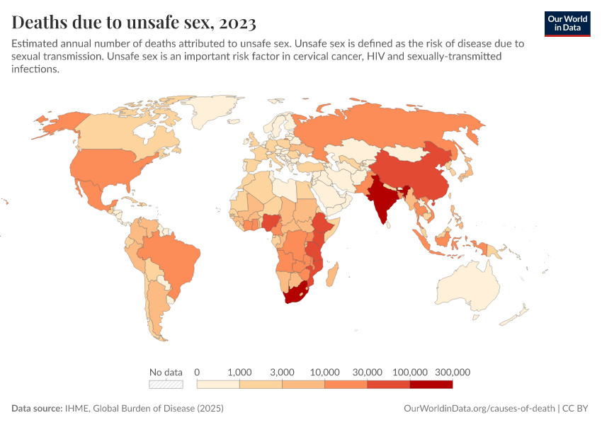 “Data Page: Deaths due to unsafe sex”, part of the following publication: Esteban Ortiz-Ospina and Max Roser (2016) - “Global Health”. Data adapted from IHME, Global Burden of Disease. Retrieved from https://archive.ourworldindata.org/20260319-180137/grapher/deaths-due-to-unsafe-sex.html [online resource] (archived on March 19, 2026).How to cite this data