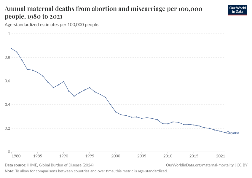 IHME, Global Burden of Disease (2024) – with minor processing by Our World in Data. “Annual maternal deaths from abortion and miscarriage per 100,000 people” [dataset]. IHME, Global Burden of Disease, “Global Burden of Disease - Deaths and DALYs” [original data]. Retrieved January 13, 2026 from https://archive.ourworldindata.org/20260108-164518/grapher/deaths-from-abortion-and-miscarriage-per-100000-people.html (archived on January 8, 2026).