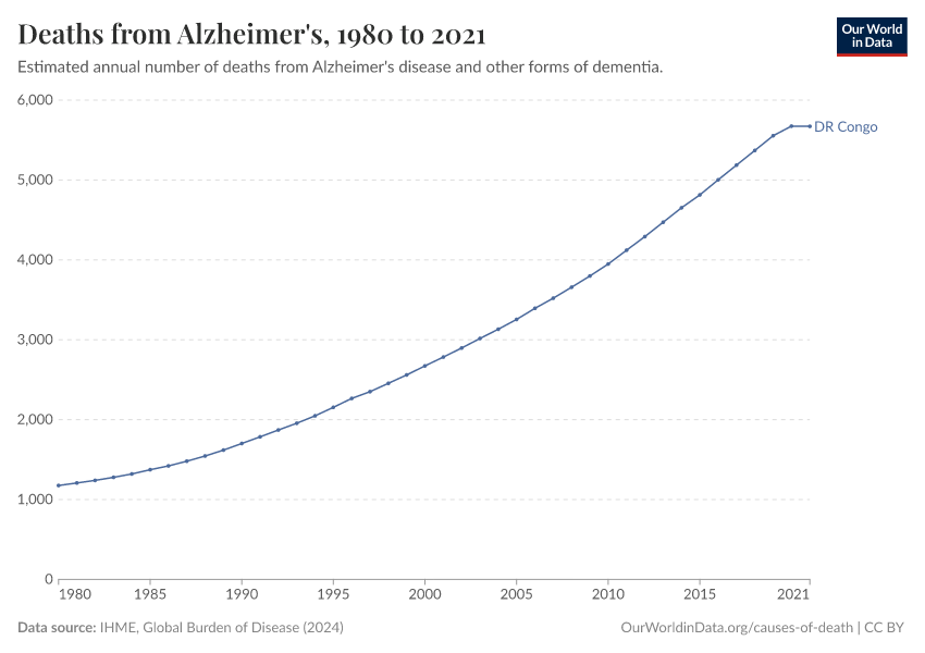 IHME, Global Burden of Disease (2024) – with minor processing by Our World in Data. “Deaths from Alzheimer's” [dataset]. IHME, Global Burden of Disease, “Global Burden of Disease - Deaths and DALYs” [original data]. Retrieved December 6, 2025 from https://archive.ourworldindata.org/20250909-093708/grapher/deaths-from-alzheimers.html (archived on September 9, 2025).