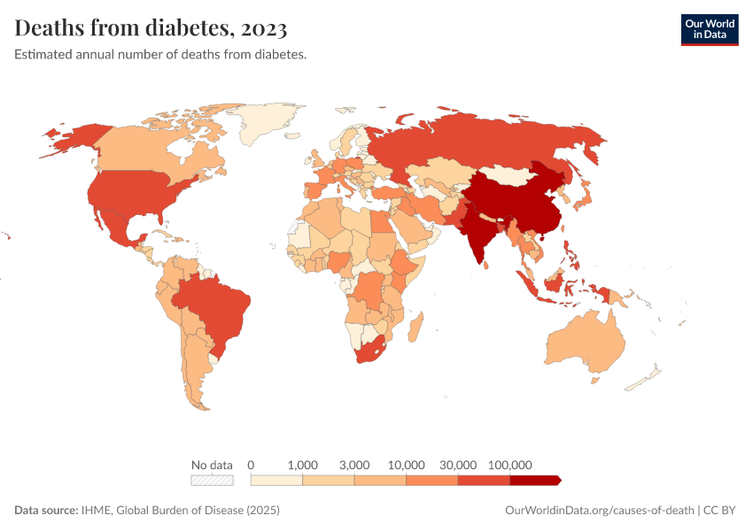 IHME, Global Burden of Disease (2025) – with major processing by Our World in Data. “Deaths from diabetes” [dataset]. IHME, Global Burden of Disease, “Global Burden of Disease - Deaths” [original data]. Retrieved March 2, 2026 from https://archive.ourworldindata.org/20260211-174736/grapher/deaths-from-diabetes.html (archived on February 11, 2026).
