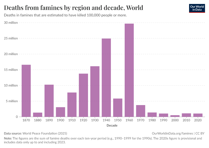 World Peace Foundation (2025) – processed by Our World in Data. “Deaths from famines by region and decade” [dataset]. World Peace Foundation, “The WPF Famine Dataset” [original data]. Retrieved March 17, 2026 from https://archive.ourworldindata.org/20260304-094028/grapher/deaths-from-famines-by-decade.html (archived on March 4, 2026).