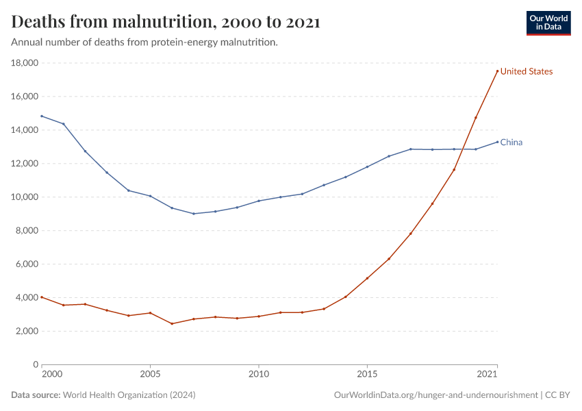 World Health Organization (2024) – with major processing by Our World in Data. “Deaths from malnutrition” [dataset]. World Health Organization, “Global Health Estimates” [original data]. Retrieved December 22, 2025 from https://archive.ourworldindata.org/20250909-093708/grapher/deaths-from-malnutrition-ghe.html (archived on September 9, 2025).
