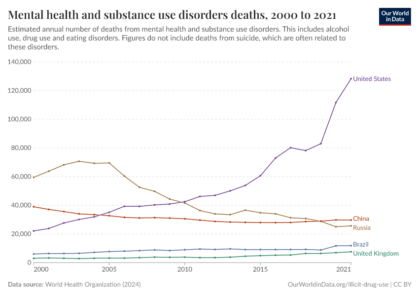 World Health Organization (2024) – with major processing by Our World in Data. “Mental health and substance use disorders deaths” [dataset]. World Health Organization, “Global Health Estimates” [original data]. Retrieved December 19, 2025 from https://archive.ourworldindata.org/20250909-093708/grapher/deaths-from-mental-health-and-substance-use-disorders-who.html (archived on September 9, 2025).