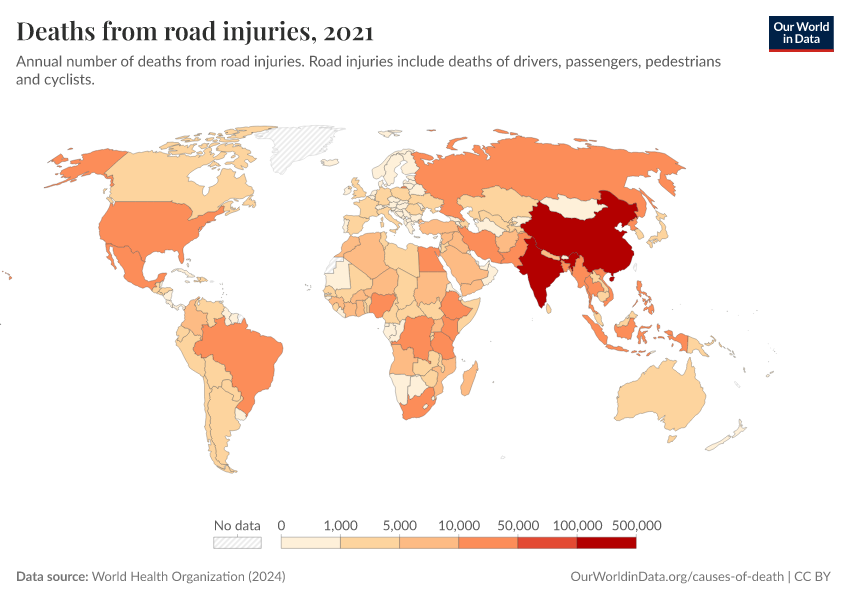 “Data Page: Deaths from road injuries”, part of the following publication: Esteban Ortiz-Ospina and Max Roser (2016) - “Global Health”. Data adapted from World Health Organization. Retrieved from https://archive.ourworldindata.org/20250909-093708/grapher/deaths-from-road-injuries.html [online resource] (archived on September 9, 2025).How to cite this data