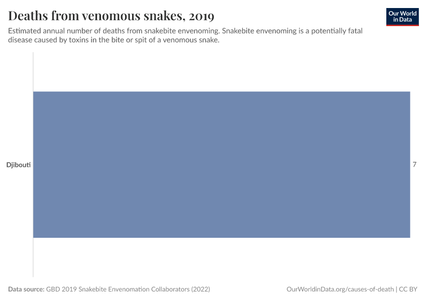 “Data Page: Deaths from venomous snakes”. Our World in Data (2025). Data adapted from GBD 2019 Snakebite Envenomation Collaborators. Retrieved from https://archive.ourworldindata.org/20250909-093708/grapher/deaths-from-snakebite-envenoming.html [online resource] (archived on September 9, 2025).How to cite this data