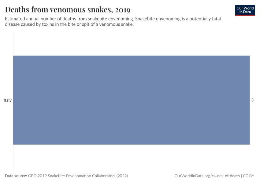 “Data Page: Deaths from venomous snakes”. Our World in Data (2025). Data adapted from GBD 2019 Snakebite Envenomation Collaborators. Retrieved from https://archive.ourworldindata.org/20250909-093708/grapher/deaths-from-snakebite-envenoming.html [online resource] (archived on September 9, 2025).