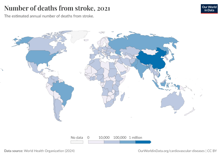 World Health Organization (2024) – with major processing by Our World in Data. “Number of deaths from stroke” [dataset]. World Health Organization, “Global Health Estimates” [original data]. Retrieved February 5, 2026 from https://archive.ourworldindata.org/20250909-093708/grapher/deaths-from-strokes-ghe.html (archived on September 9, 2025).