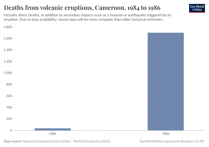 National Geophysical Data Center / World Data Service (2025) – with major processing by Our World in Data. “Deaths from volcanic eruptions – NOAA/NCEI” [dataset]. National Geophysical Data Center / World Data Service, “Significant Volcanic Eruptions Database” [original data]. Retrieved January 1, 2026 from https://archive.ourworldindata.org/20251030-215433/grapher/deaths-from-volcanic-eruptions.html (archived on October 30, 2025).