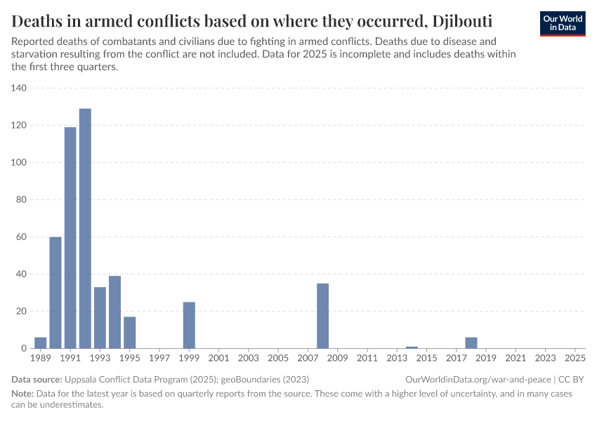 • UCDP's data for 2025 is preliminary. This means the number of deaths may be too low because more information becomes available later, or they may be too high because some events are later found not to be part of an armed conflict. We still show this data to provide more up-to-date information, but figures on this chart may change in the future if UCDP revises its estimates.