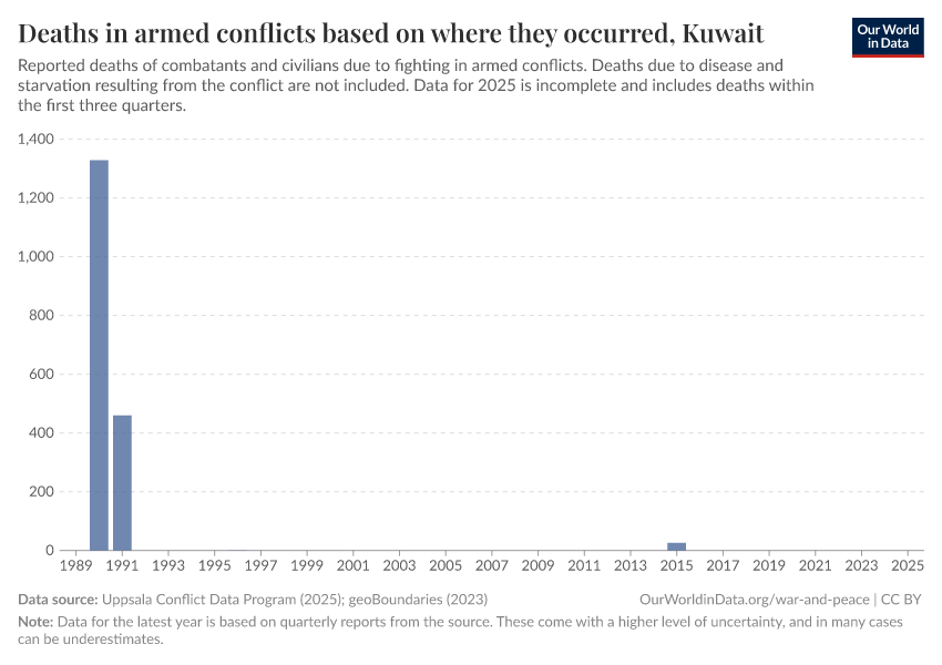 - UCDP's data for 2025 is preliminary. This means the number of deaths may be too low because more information becomes available later, or they may be too high because some events are later found not to be part of an armed conflict. We still show this data to provide more up-to-date information, but figures on this chart may change in the future if UCDP revises its estimates.