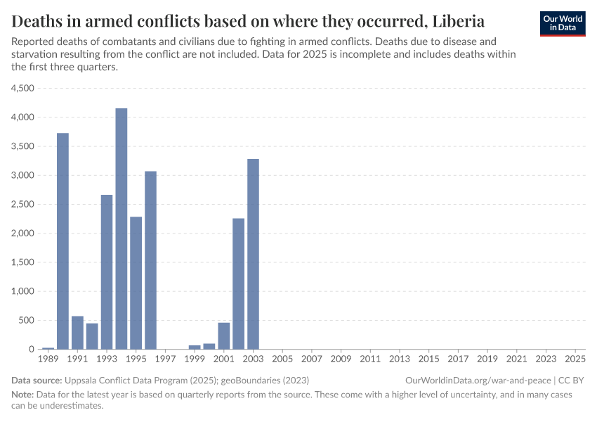 • UCDP's data for 2025 is preliminary. This means the number of deaths may be too low because more information becomes available later, or they may be too high because some events are later found not to be part of an armed conflict. We still show this data to provide more up-to-date information, but figures on this chart may change in the future if UCDP revises its estimates.