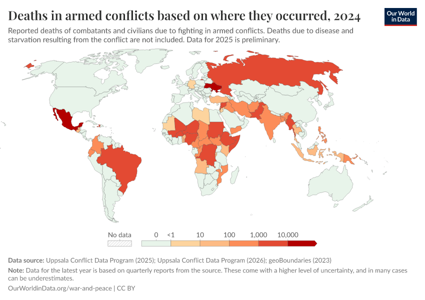 Uppsala Conflict Data Program (2025); Uppsala Conflict Data Program (2026); geoBoundaries (2023) – processed by Our World in Data. “Deaths in armed conflicts based on where they occurred” [dataset]. Uppsala Conflict Data Program, “Georeferenced Event Dataset v25.1”; Uppsala Conflict Data Program, “Candidate Events Dataset v25.01.25.12”; geoBoundaries, “geoBoundaries - Comprehensive Global Administrative Zones (CGAZ) 6.0.0” [original data]. Retrieved April 4, 2026 from https://archive.ourworldindata.org/20260304-094028/grapher/deaths-in-armed-conflicts-by-country.html (archived on March 4, 2026).