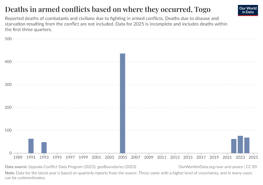 • UCDP's data for 2025 is preliminary. This means the number of deaths may be too low because more information becomes available later, or they may be too high because some events are later found not to be part of an armed conflict. We still show this data to provide more up-to-date information, but figures on this chart may change in the future if UCDP revises its estimates.