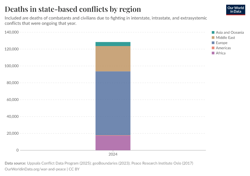 “Data Page: Deaths in state-based conflicts by region”, part of the following publication: Bastian Herre, Lucas Rodés-Guirao, and Max Roser (2024) - “War and Peace”. Data adapted from Uppsala Conflict Data Program, geoBoundaries, Peace Research Institute Oslo. Retrieved from https://archive.ourworldindata.org/20250909-093708/grapher/deaths-in-state-based-conflicts-by-region.html [online resource] (archived on September 9, 2025).How to cite this data