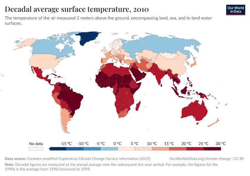 “Data Page: Decadal average surface temperature”, part of the following publication: Hannah Ritchie, Pablo Rosado, and Veronika Samborska (2024) - “Climate Change”. Data adapted from Contains modified Copernicus Climate Change Service information. Retrieved from https://archive.ourworldindata.org/20251110-151510/grapher/decadal-average-surface-temperature.html [online resource] (archived on November 10, 2025).How to cite this data