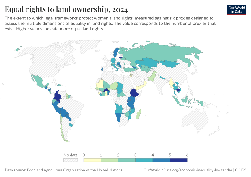 Food and Agriculture Organization of the United Nations – processed by Our World in Data. “Equal rights to land ownership” [dataset]. Food and Agriculture Organization of the United Nations, “Data from multiple sources” [original data]. Retrieved January 1, 2026 from https://archive.ourworldindata.org/20251120-211749/grapher/degree-to-which-the-legal-framework-guarantees-womens-equal-rights-to-land-ownership-andor-control.html (archived on November 20, 2025).