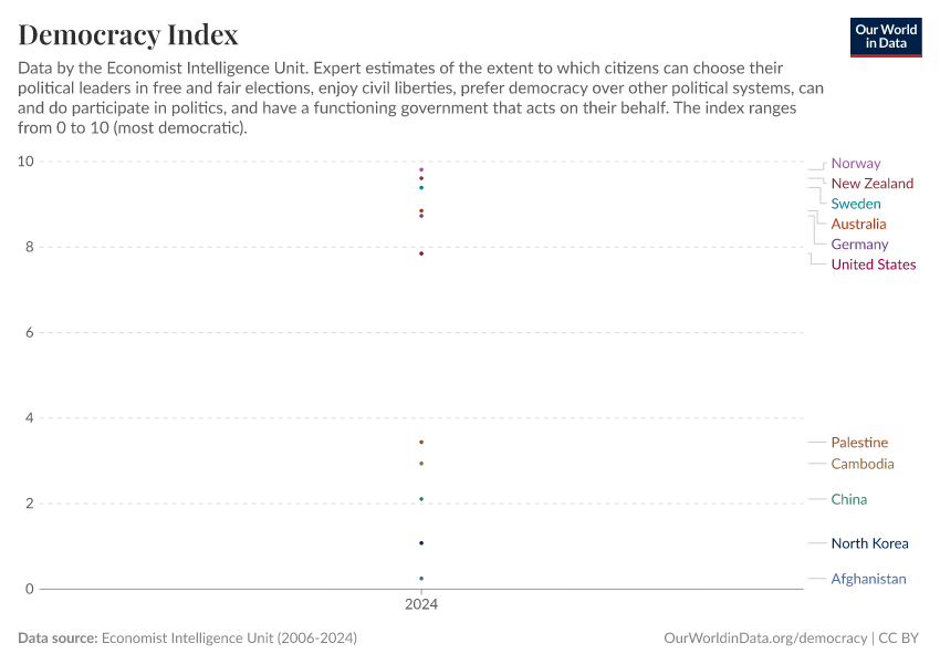 Economist Intelligence Unit (2006-2024) – processed by Our World in Data. “Democracy index – Economist Intelligence Unit” [dataset]. Economist Intelligence Unit, “Democracy Index 2021: The China challenge”; Economist Intelligence Unit, “Democracy Index 2022: Frontline democracy and the battle for Ukraine”; Economist Intelligence Unit, “Democracy Index 2023: Age of Conflict”; Economist Intelligence Unit, “Democracy Index 2024: What's wrong with representative democracy?”; Gapminder, “Democracy Index v4”; Various sources, “Population” [original data]. Retrieved December 10, 2025 from https://archive.ourworldindata.org/20251209-133038/grapher/democracy-index-eiu.html (archived on December 9, 2025).