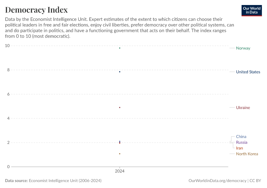Economist Intelligence Unit (2006-2024) – processed by Our World in Data. “Democracy index – Economist Intelligence Unit” [dataset]. Economist Intelligence Unit, “Democracy Index 2021: The China challenge”; Economist Intelligence Unit, “Democracy Index 2022: Frontline democracy and the battle for Ukraine”; Economist Intelligence Unit, “Democracy Index 2023: Age of Conflict”; Economist Intelligence Unit, “Democracy Index 2024: What's wrong with representative democracy?”; Gapminder, “Democracy Index v4”; Various sources, “Population” [original data]. Retrieved December 14, 2025 from https://archive.ourworldindata.org/20251209-133038/grapher/democracy-index-eiu.html (archived on December 9, 2025).