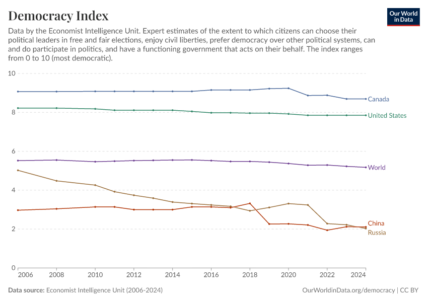 Economist Intelligence Unit (2006-2024) – processed by Our World in Data. “Democracy index – Economist Intelligence Unit” [dataset]. Economist Intelligence Unit, “Democracy Index 2021: The China challenge”; Economist Intelligence Unit, “Democracy Index 2022: Frontline democracy and the battle for Ukraine”; Economist Intelligence Unit, “Democracy Index 2023: Age of Conflict”; Economist Intelligence Unit, “Democracy Index 2024: What's wrong with representative democracy?”; Gapminder, “Democracy Index v4”; Various sources, “Population” [original data]. Retrieved January 15, 2026 from https://archive.ourworldindata.org/20260105-133053/grapher/democracy-index-eiu.html (archived on January 5, 2026).