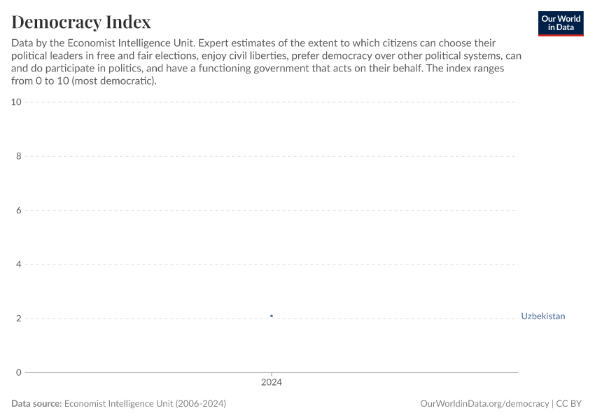 Economist Intelligence Unit (2006-2024) – processed by Our World in Data. “Democracy index – Economist Intelligence Unit” [dataset]. Economist Intelligence Unit, “Democracy Index 2021: The China challenge”; Economist Intelligence Unit, “Democracy Index 2022: Frontline democracy and the battle for Ukraine”; Economist Intelligence Unit, “Democracy Index 2023: Age of Conflict”; Economist Intelligence Unit, “Democracy Index 2024: What's wrong with representative democracy?”; Gapminder, “Democracy Index v4”; Various sources, “Population” [original data]. Retrieved December 19, 2025 from https://archive.ourworldindata.org/20251209-133038/grapher/democracy-index-eiu.html (archived on December 9, 2025).