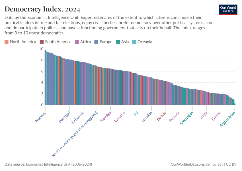 Economist Intelligence Unit (2006-2024) – processed by Our World in Data. “Democracy index – Economist Intelligence Unit” [dataset]. Economist Intelligence Unit, “Democracy Index 2021: The China challenge”; Economist Intelligence Unit, “Democracy Index 2022: Frontline democracy and the battle for Ukraine”; Economist Intelligence Unit, “Democracy Index 2023: Age of Conflict”; Economist Intelligence Unit, “Democracy Index 2024: What's wrong with representative democracy?”; Gapminder, “Democracy Index v4”; Various sources, “Population” [original data]. Retrieved April 9, 2026 from https://archive.ourworldindata.org/20260402-164039/grapher/democracy-index-eiu.html (archived on April 2, 2026).