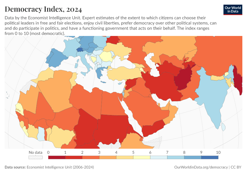 Economist Intelligence Unit (2006-2024) – processed by Our World in Data. “Democracy index – Economist Intelligence Unit” [dataset]. Economist Intelligence Unit, “Democracy Index 2021: The China challenge”; Economist Intelligence Unit, “Democracy Index 2022: Frontline democracy and the battle for Ukraine”; Economist Intelligence Unit, “Democracy Index 2023: Age of Conflict”; Economist Intelligence Unit, “Democracy Index 2024: What's wrong with representative democracy?”; Gapminder, “Democracy Index v4”; Various sources, “Population” [original data]. Retrieved April 2, 2026 from https://archive.ourworldindata.org/20260325-171315/grapher/democracy-index-eiu.html (archived on March 25, 2026).Download