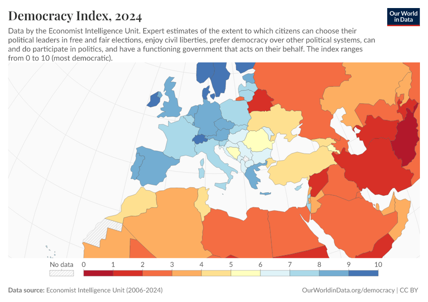 Economist Intelligence Unit (2006-2024) – processed by Our World in Data. “Democracy index – Economist Intelligence Unit” [dataset]. Economist Intelligence Unit, “Democracy Index 2021: The China challenge”; Economist Intelligence Unit, “Democracy Index 2022: Frontline democracy and the battle for Ukraine”; Economist Intelligence Unit, “Democracy Index 2023: Age of Conflict”; Economist Intelligence Unit, “Democracy Index 2024: What's wrong with representative democracy?”; Gapminder, “Democracy Index v4”; Various sources, “Population” [original data]. Retrieved April 5, 2026 from https://archive.ourworldindata.org/20260402-164039/grapher/democracy-index-eiu.html (archived on April 2, 2026).Download