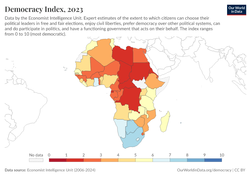 - This index, produced by the Economist Intelligence Unit (EIU), is useful if you are interested in recent trends, want scores for almost all countries, and prefer a broad understanding of democracy. For data that covers the more distant past or focuses on more specific aspects of democracy, other sources will be more useful. You can explore these alternatives in our Key Democracy Charts and Democracy Data Explorer.