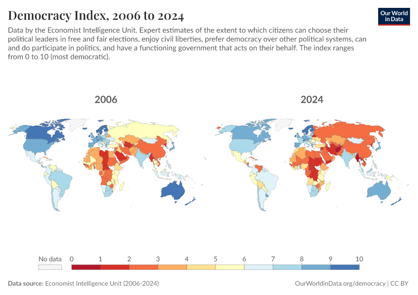 Economist Intelligence Unit (2006-2024) – processed by Our World in Data. “Democracy index – Economist Intelligence Unit” [dataset]. Economist Intelligence Unit, “Democracy Index 2021: The China challenge”; Economist Intelligence Unit, “Democracy Index 2022: Frontline democracy and the battle for Ukraine”; Economist Intelligence Unit, “Democracy Index 2023: Age of Conflict”; Economist Intelligence Unit, “Democracy Index 2024: What's wrong with representative democracy?”; Gapminder, “Democracy Index v4”; Various sources, “Population” [original data]. Retrieved April 28, 2026 from https://archive.ourworldindata.org/20260417-112857/grapher/democracy-index-eiu.html (archived on April 17, 2026).Download